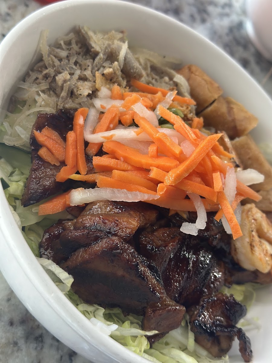 Start your culinary journey with the Cha Gio Fried Egg Rolls for just $3.95, which are a delightful starter to whet your appetite. These crispy rolls are filled with a savory mix, offering a satisfying crunch and bursting with flavor. Alternatively, indulge in the Chicken Wings—six pieces for $5.95—perfect for sharing (or keeping all to yourself!).